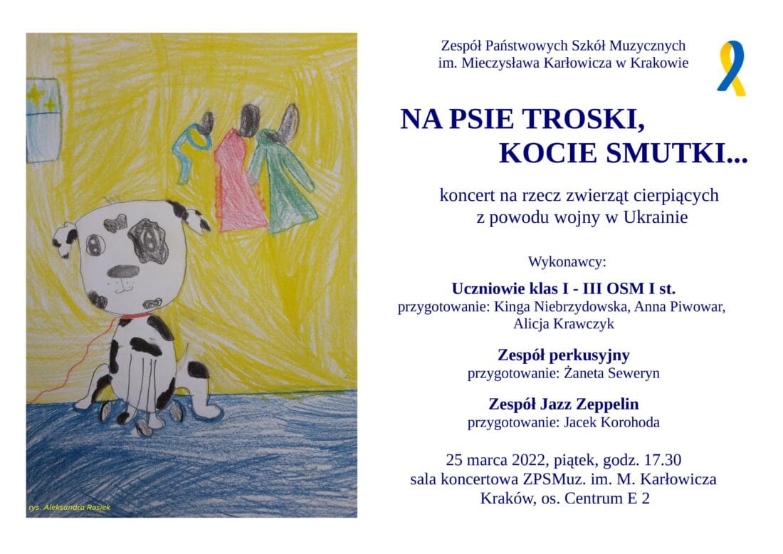 Serdecznie zapraszamy na koncert na rzecz zwierzaków, który odbędzie się w Zespół Państwowych Szkół Muzycznych im. Mieczysława Karłowicza w Krakowie przy oś. Centrum E 2 dnia 25.03.2022 r. o godzinie 17:00.